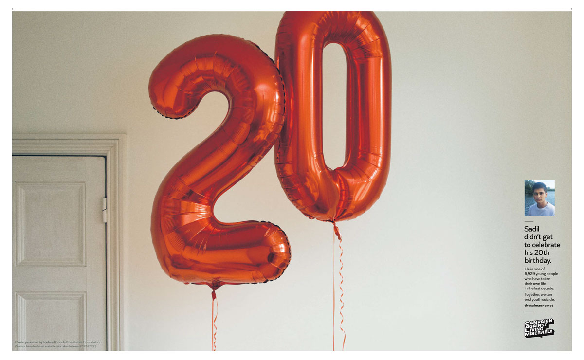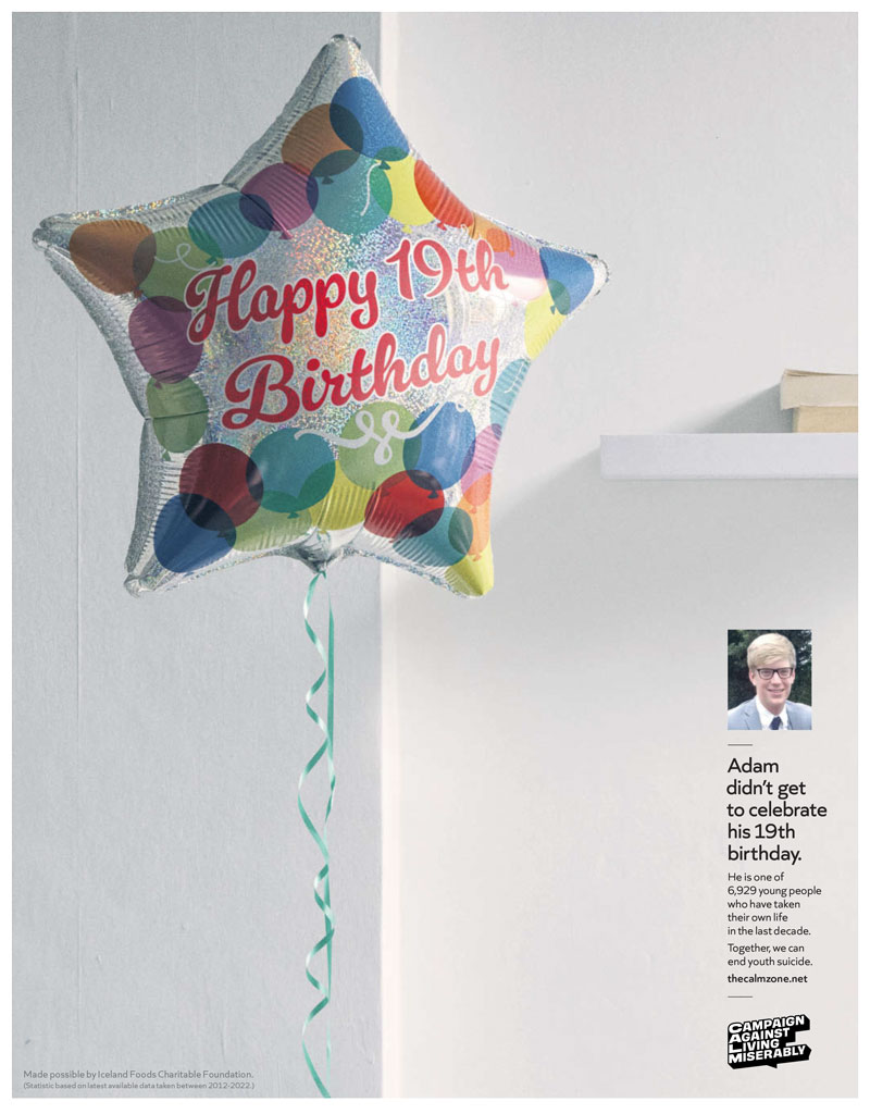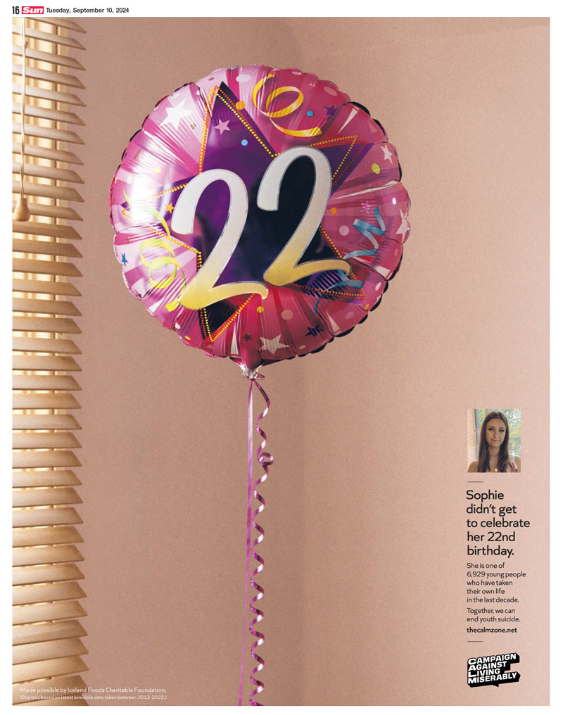 In a poignant multi-news brand campaign with three different images, CALM spotlights the stories of Sadil, Adam and Sophie, three young people who were not able to make it to their next birthday after dying by suicide.