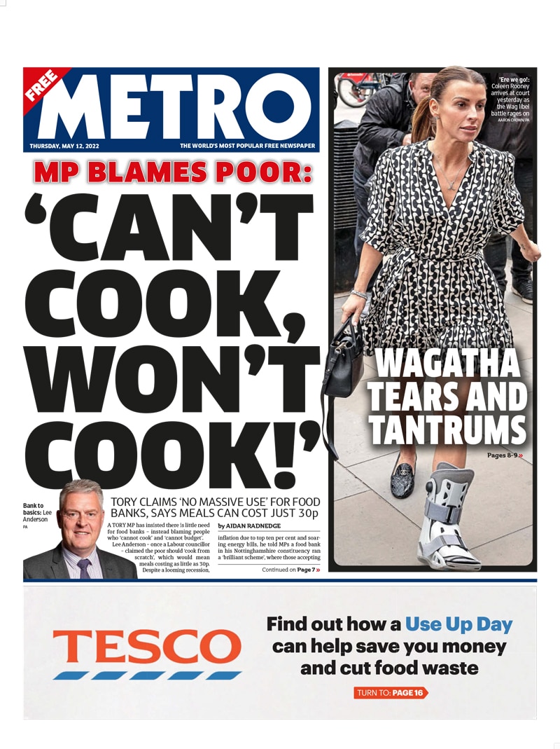 The supermarket’s ‘Use Up Day’ ad appeared underneath yesterday’s Metro front page headline, which showed an MP blaming poorer households’ struggles to afford rising living costs on being unable to manage meals or money