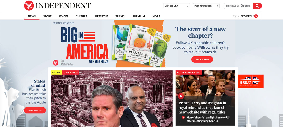 A digital wrap on The Independent’s homepage links through to partner video content specially created for the news brand’s Independent TV platform. The five-part series ‘Big in America’, presented by businesswoman and presenter Alex Polizzi, explores the stories of five British businesses looking to grow exports in the US with help from the Department for Business and Trade.