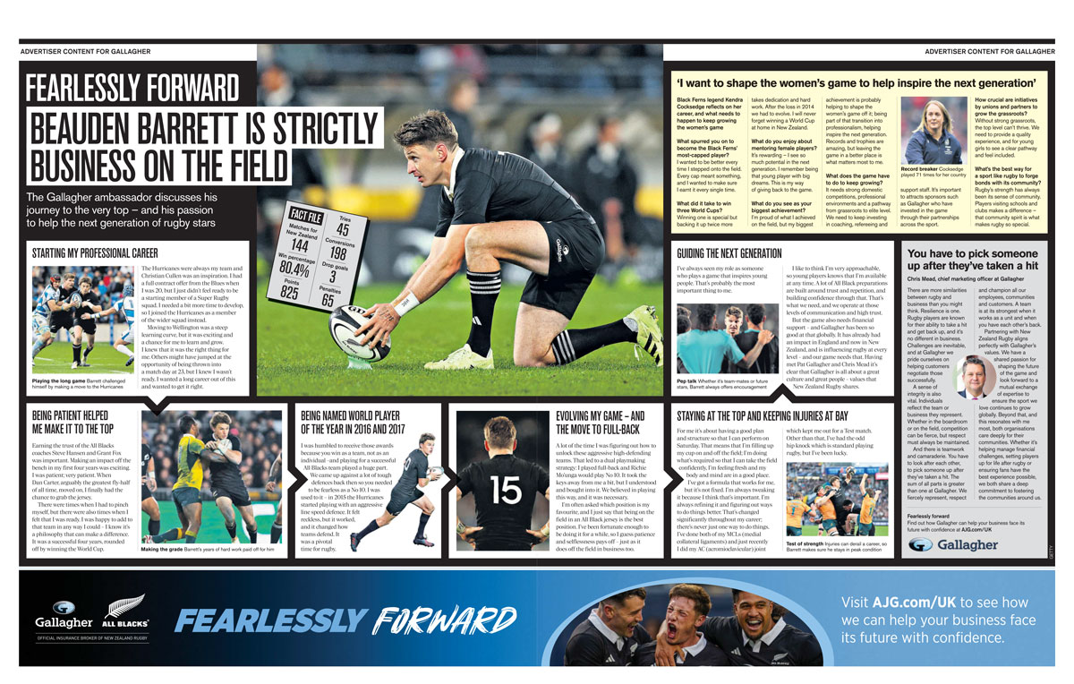 The content, a cover wrap of The Daily Telegraph’s ‘Sport’ section last Saturday, speaks to Barrett about how he made it all the way to the All Blacks, while Gallagher’s chief marketing officer Chris Mead explores how rugby and business have more similarities than readers might think.