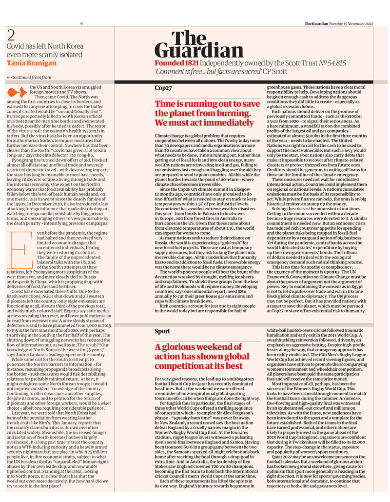 Katharine Viner, editor-in-chief of Guardian News and Media, said: “With Cop27 taking place in Egypt, we wanted to publish an ambitious editorial that highlights how strongly many different news organisations, and our readers, feel about the climate crisis.