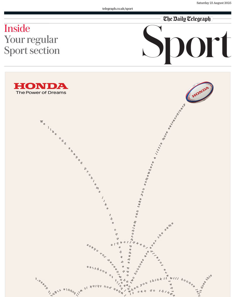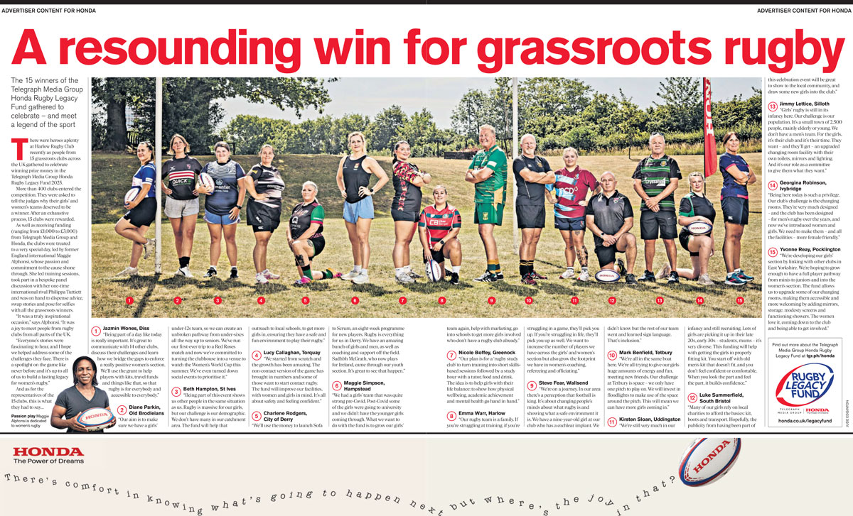 In a wrap of last Saturday’s print edition of its ‘Sport’ section, The Daily Telegraph and Honda celebrate the 15 winners of their ‘Rugby Legacy Fund’
