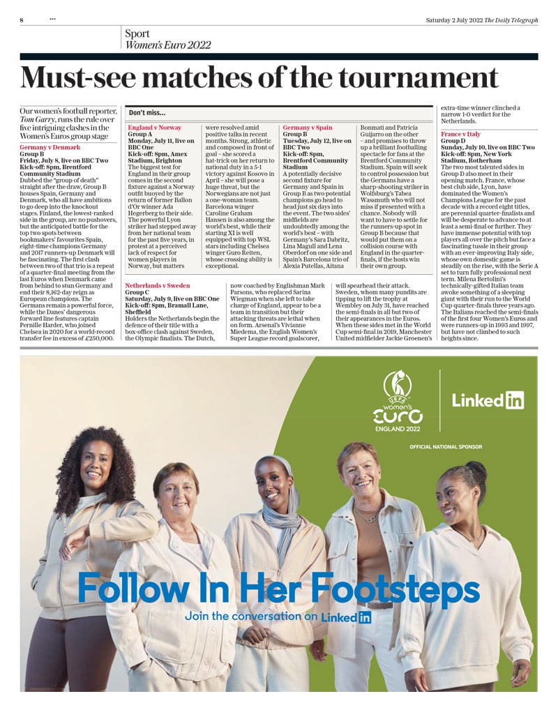 The partnership between The Telegraph and LinkedIn will continue throughout the tournament with an emotive and inspiring branded content series on the news publisher’s website, celebrating the role of female trailblazers in shaping the modern women’s game. LinkedIn’s news brand ads are part of its wider campaign as an official partner of the EURO 2022 finals.