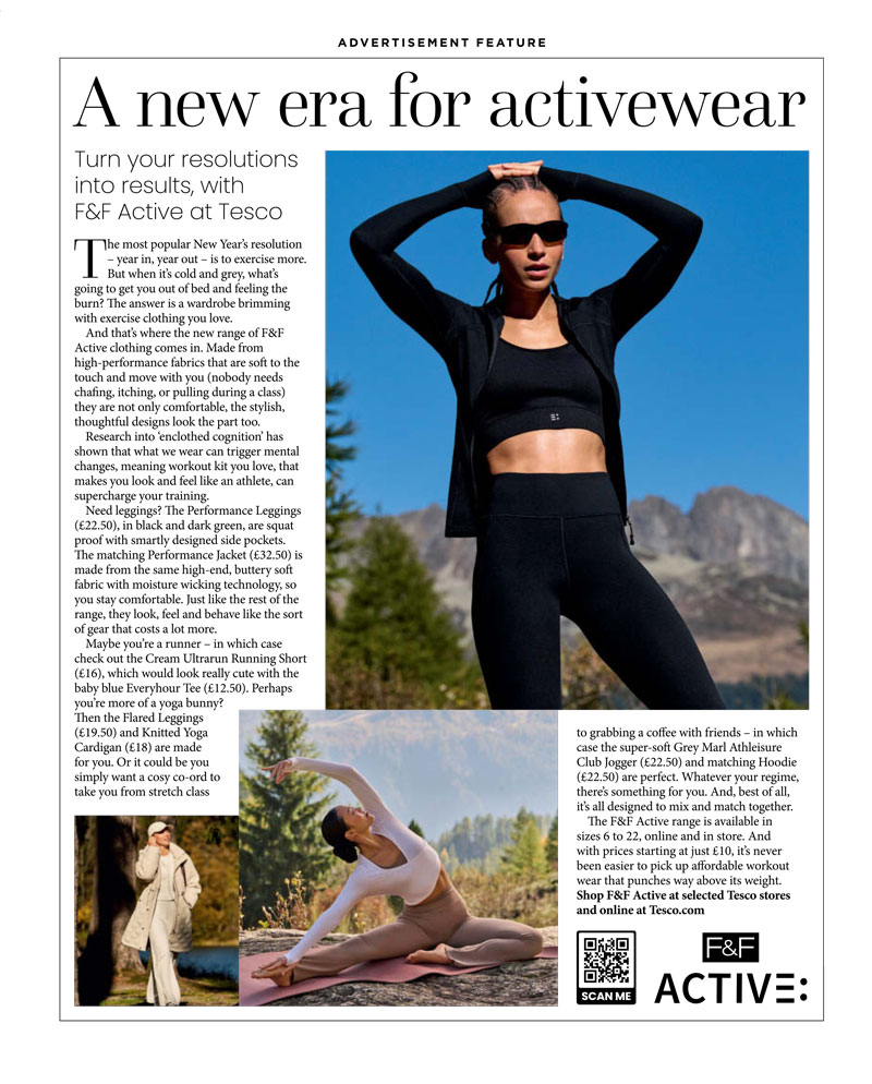The partnership encourages readers to shop F&F’s ‘Active’ range in selected Tesco stores and online on the supermarket’s website.
