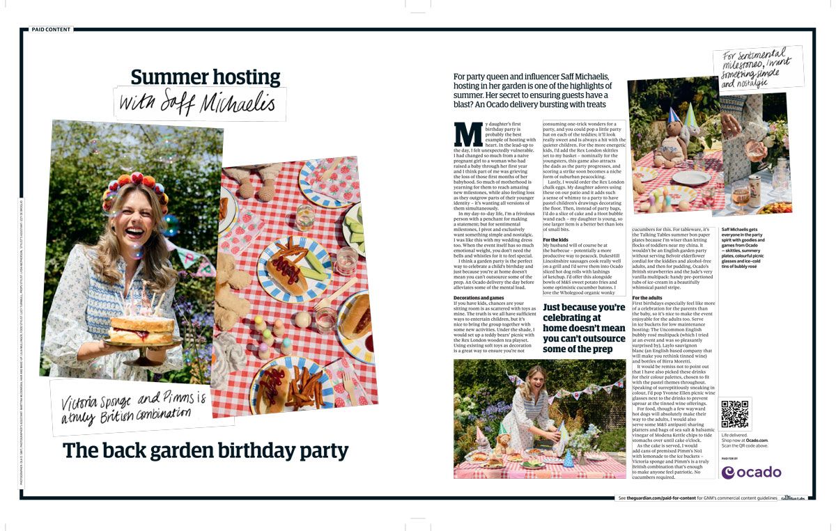 As part of its ‘Life Delivered’ multiplatform brand partnership campaign with the Guardian, Ocado enlists party queen and influencer Saff Michaelis to pull off the ultimate summer garden party