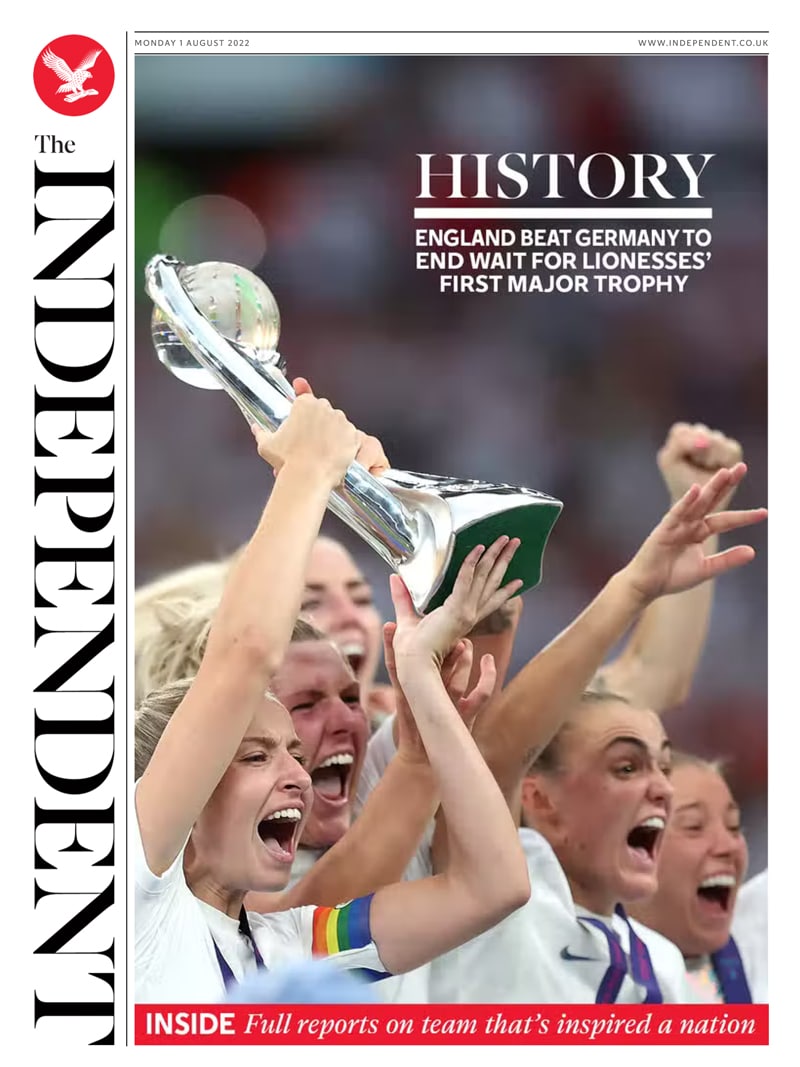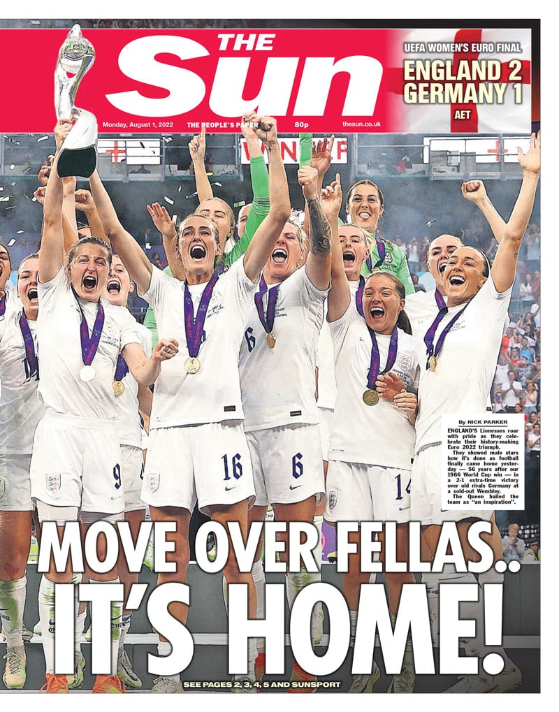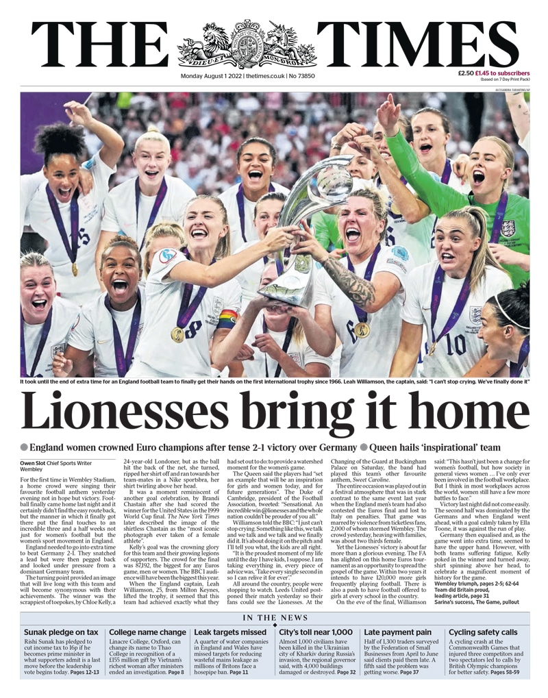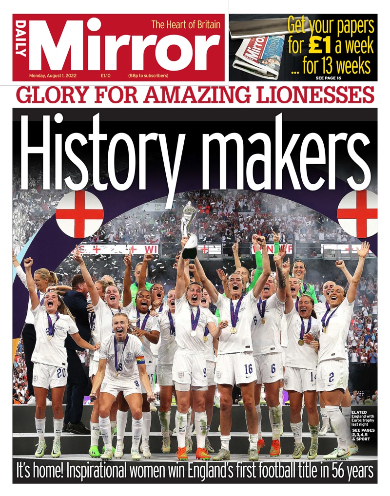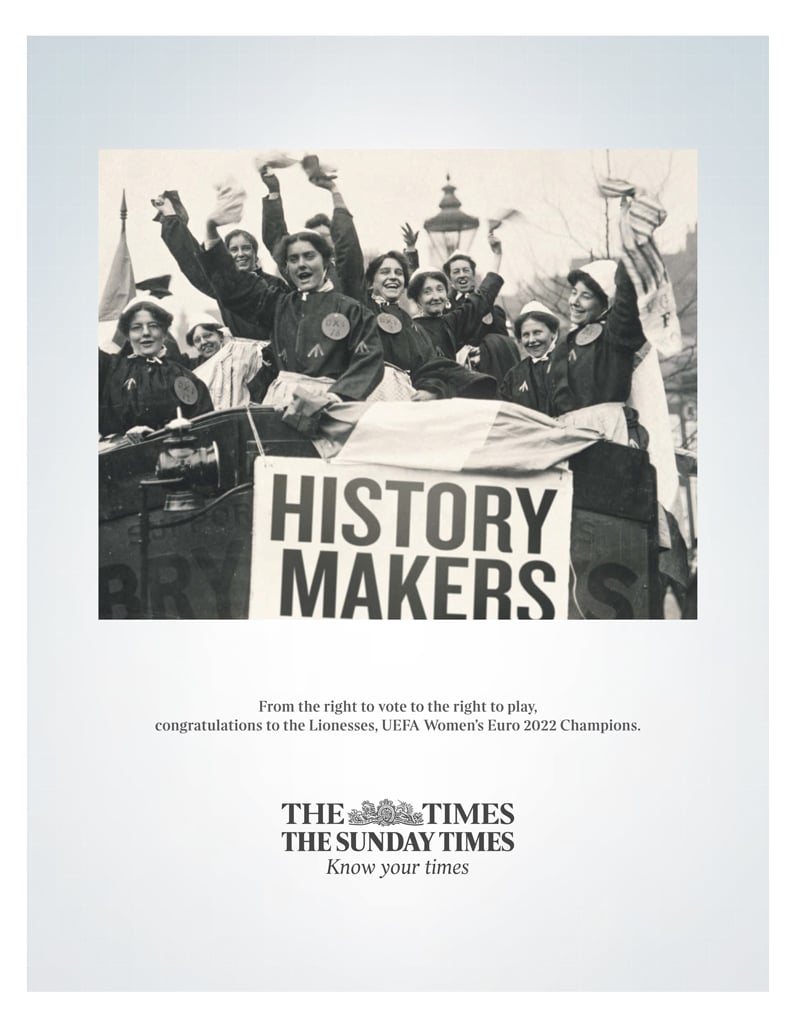 Meanwhile, The Times and The Sunday Times reminded readers of female “history makers” with copy reading: “From the right to vote to the right to play, congratulations to the Lionesses, UEFA Women’s Euro 2022 Champions.”