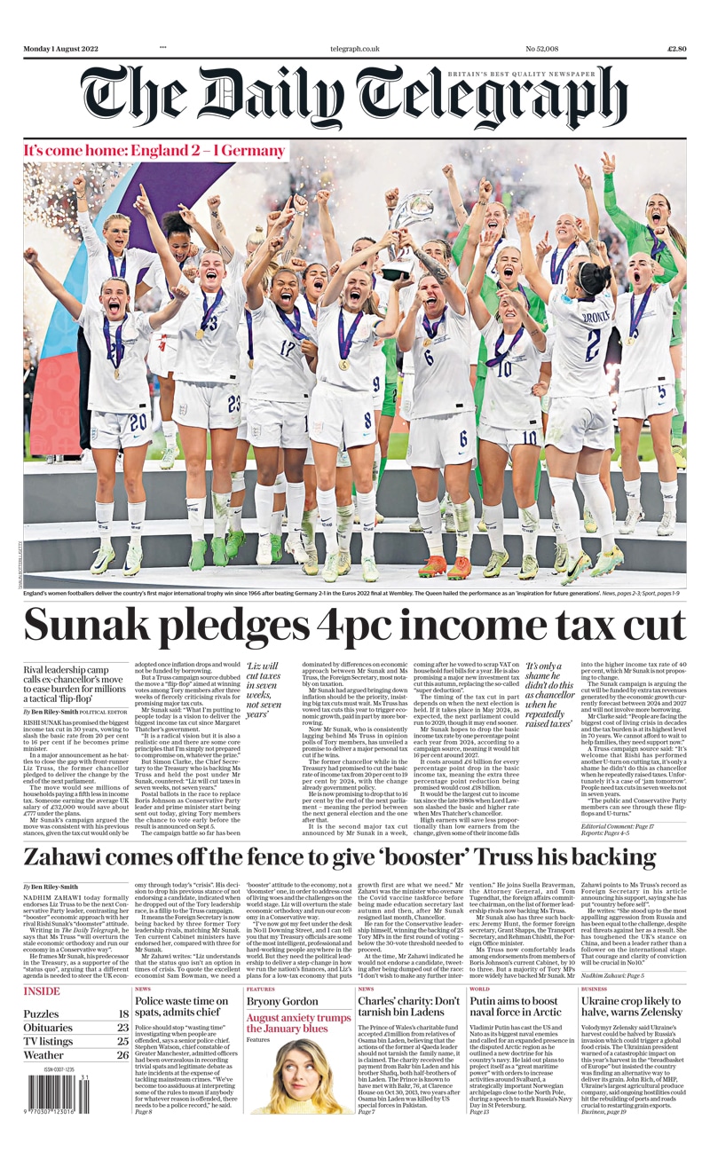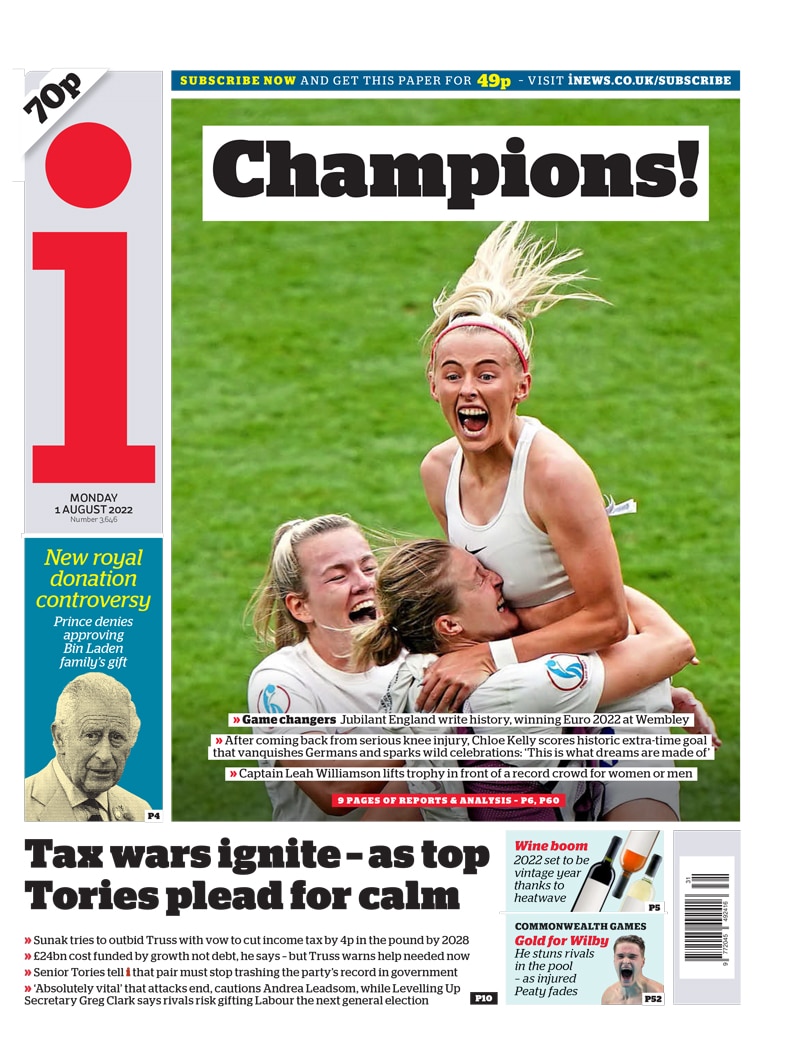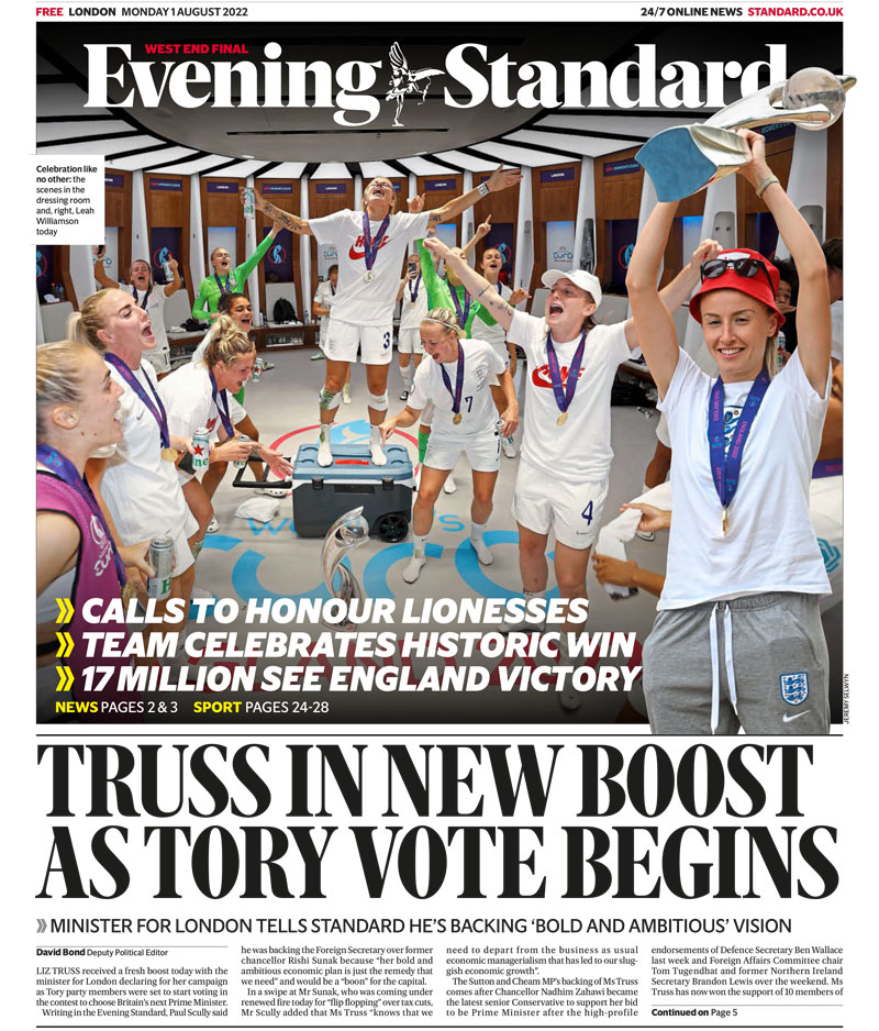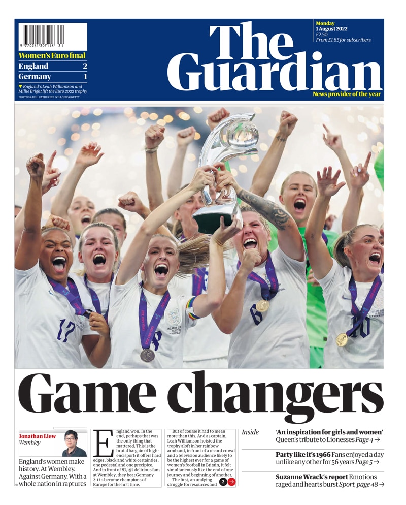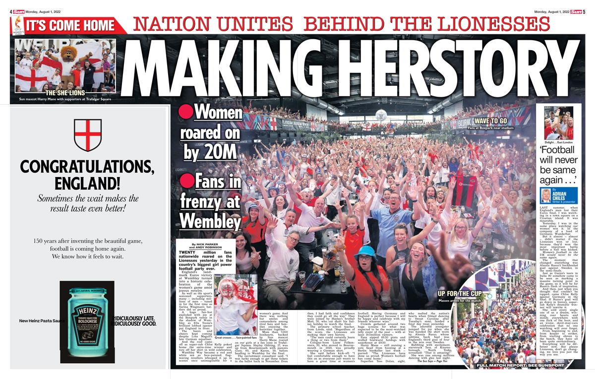 Meanwhile, The Times and The Sunday Times reminded readers of female “history makers” with copy reading: “From the right to vote to the right to play, congratulations to the Lionesses, UEFA Women’s Euro 2022 Champions.”