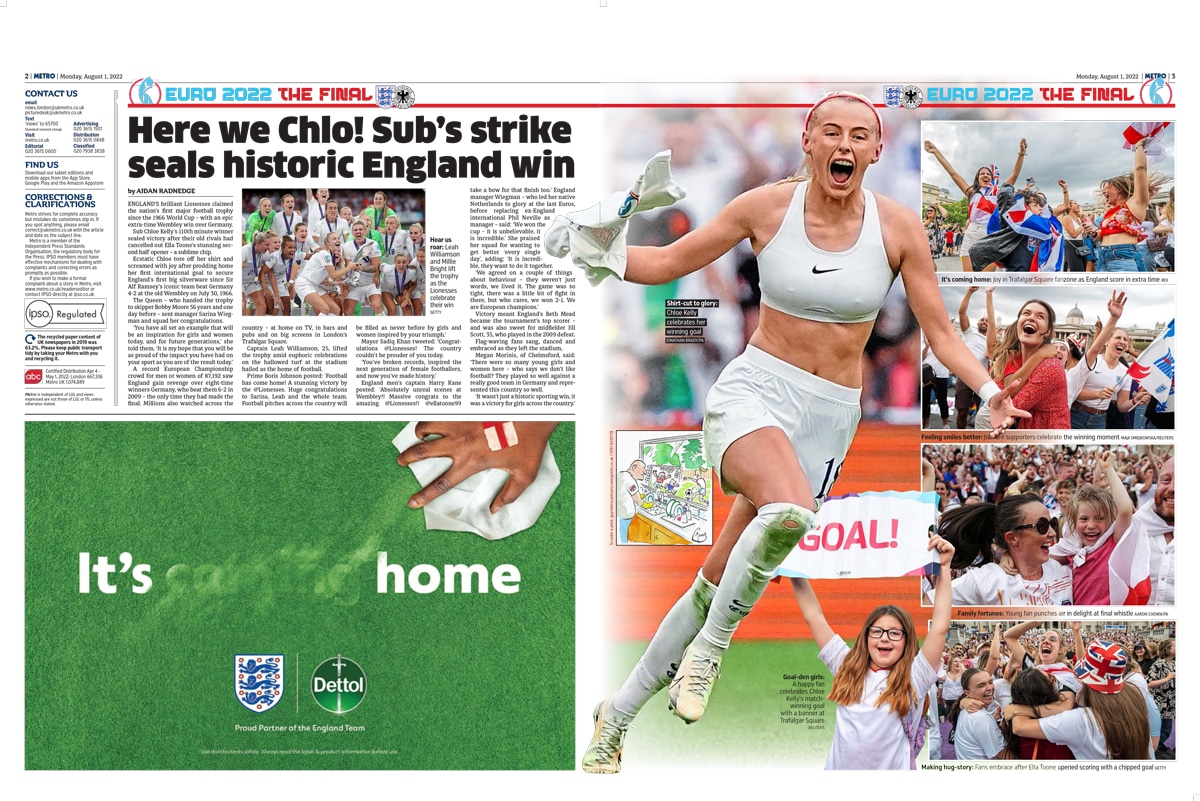 As the England team lift the trophy after a nail-biting 2-1 victory against Germany, making history and bringing home the first major silverware in 56 years, news brands capture the mood of the nation with a stellar selection of triumphant front pages.