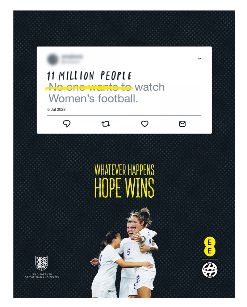 EE delivered a powerful message: “11 million people watch Women’s football… whatever happens, hope wins,” hitting back at a misjudged tweet suggesting that “no-one wants to watch”.