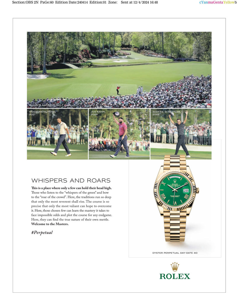 Using evocative prose and glorious shots of Augusta’s most recent winners, the ad celebrates the unique traditions and emotions of the Masters, as well as Rolex’s role as sponsor.