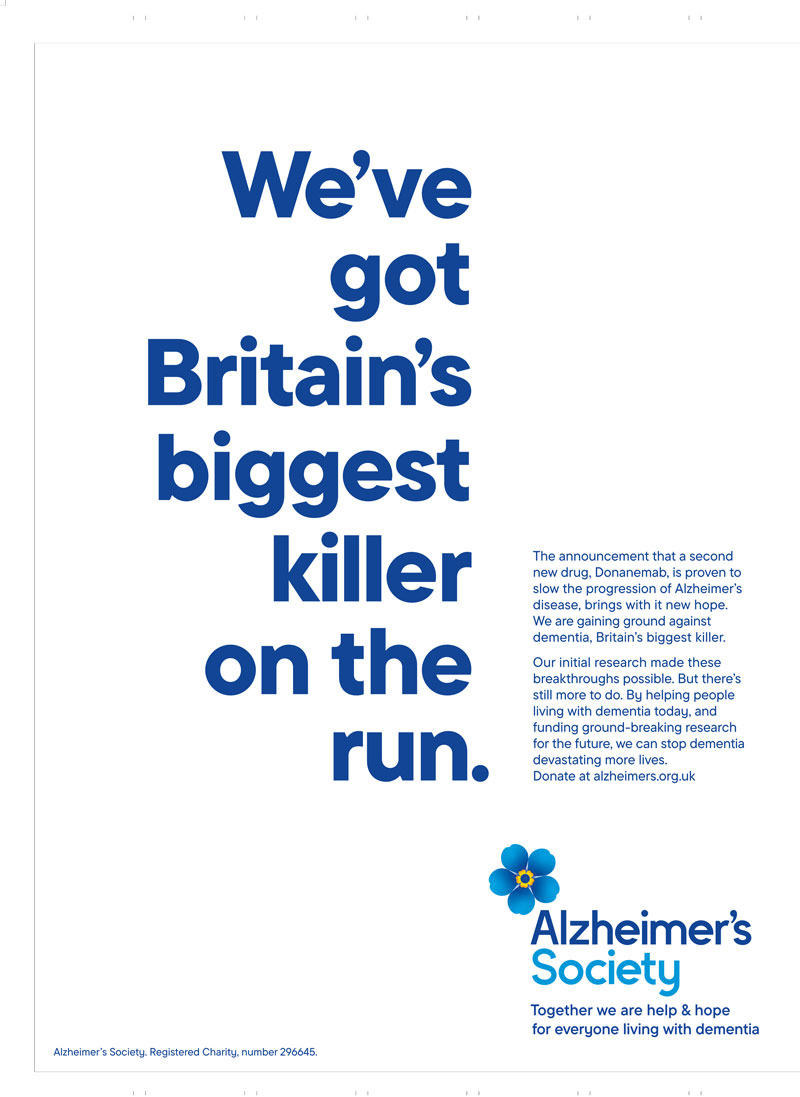 Although a new drug has been announced to slow the progression of Alzheimer’s disease, this ad reminds readers there’s still more to do