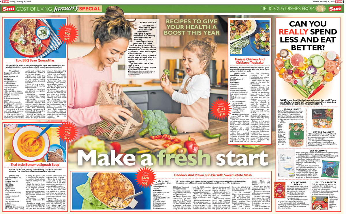 In an eight-page pullout, the brand partnership offers affordable family recipes, free fitness ideas and money-saving tips. The feature, published in last Friday’s print edition of The Sun, is packed with inspiration to help readers reset their priorities and stick to their New Year’s resolutions.