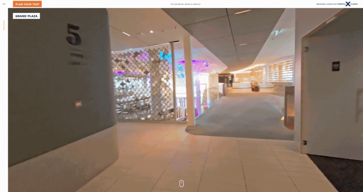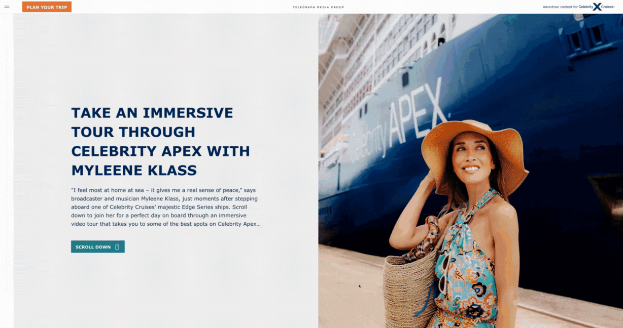 The page invites readers to scroll through the content, activating drone videos of each part of the luxurious Celebrity Apex liner. Each section is accompanied by top tips from broadcaster and musician Myleene Klass, whether that’s taking in the buzz of the Grand Plaza, the serenity of the spa or the best in fine dining.