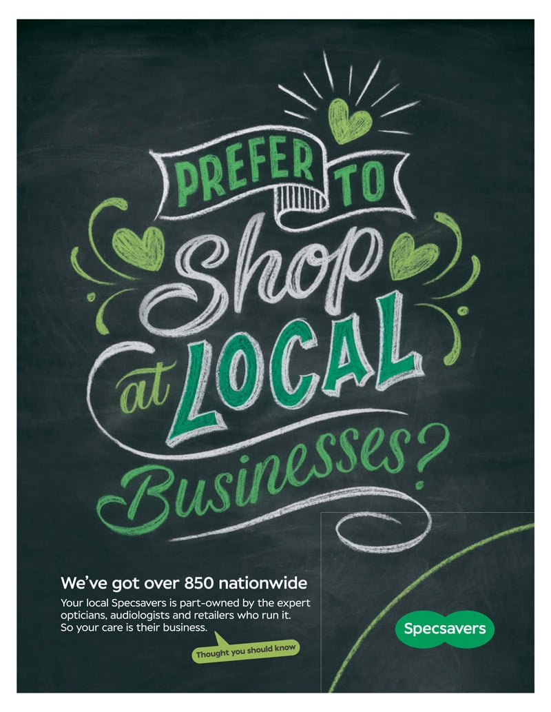 The opticians are well known for turning to the tongue-in-cheek when it comes to encouraging readers to take eye tests, but this campaign plays it straight, speaking to the many who prefer to shop at local businesses.