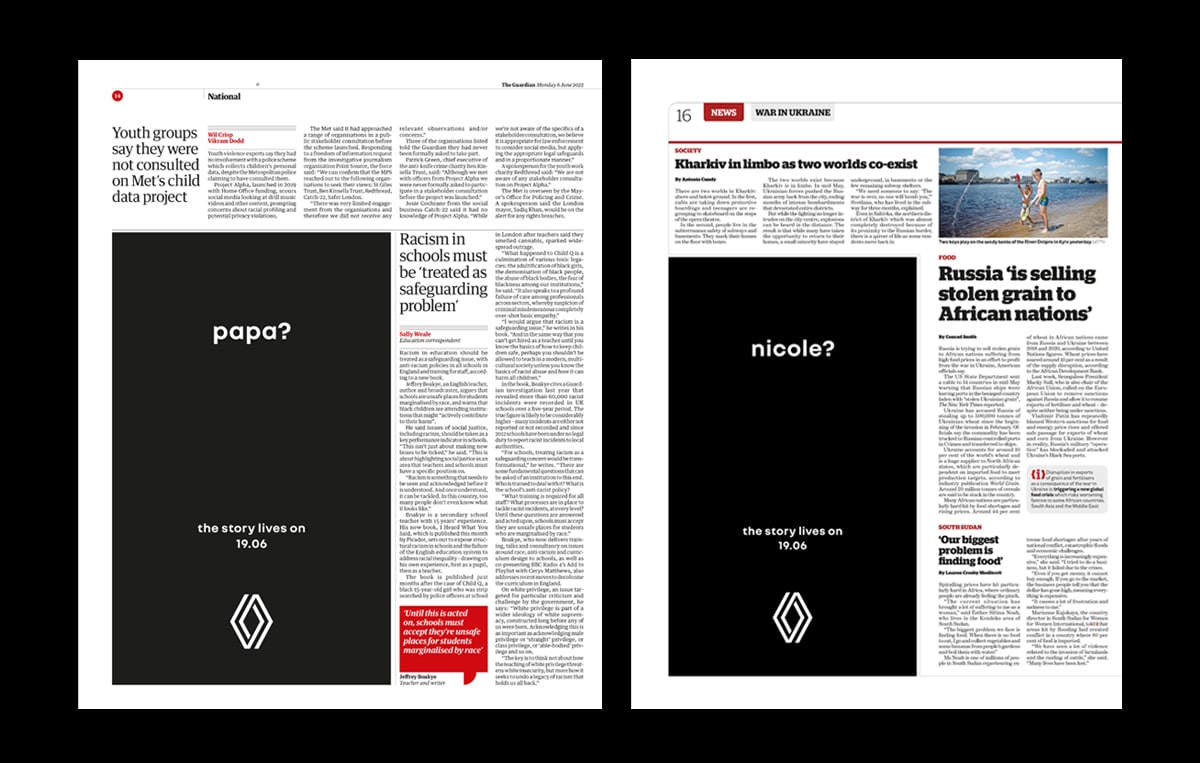 Like Swatch and Omega earlier this year, the automotive company uses the element of mystery to keep readers on tenterhooks. This news brand ad was a cryptic preview for Renault’s wider campaign around Father’s Day, following fathers and their daughters named Nicole in homage to its famous “Papa and Nicole” ads from the 1990s.