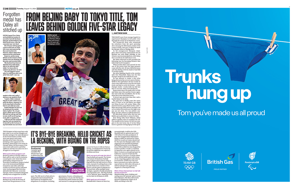 After winning a silver medal in Paris, Tom announced his retirement soon afterwards — immediately, British Gas decided it wanted to honour his career. With the opportunity to react quickly and contextually, British Gas knew that news brands were the ideal platform to express their gratitude for his illustrious career and demonstrate national support.